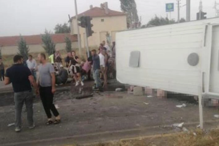 Kaza, Emirdağ ilçesi Suvermez Kavşağı’nda meydana geldi. Edinilen bilgilere göre, kamyonet ile çarpışan midibüs kontrolden çıkarak devrildi.