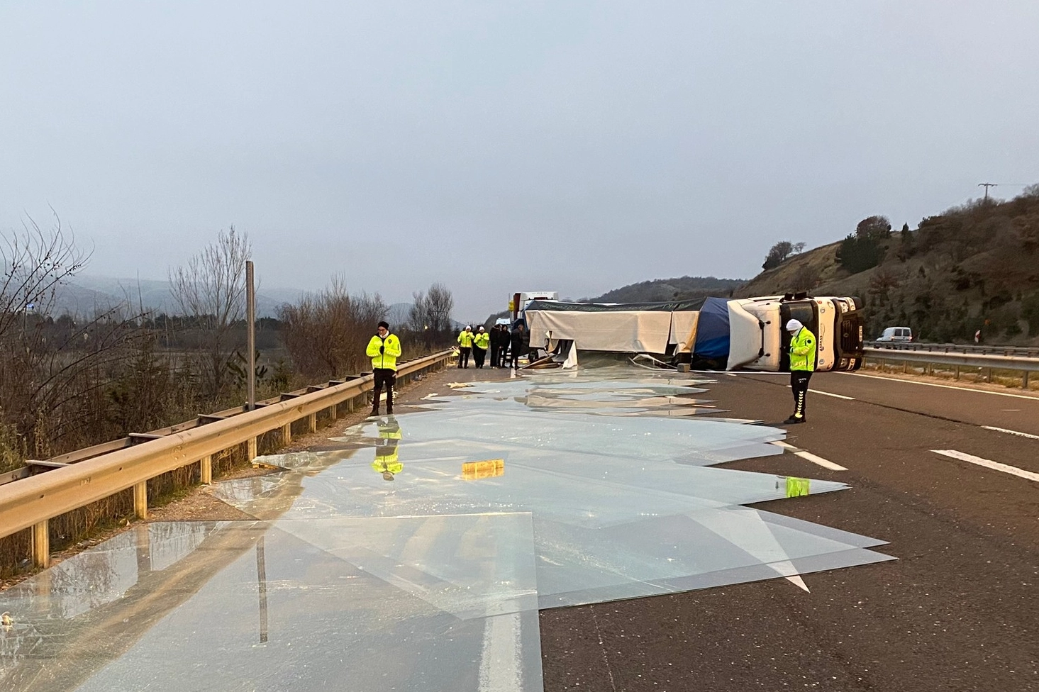 Diğer taraftan kazanın ardından araçta bulunan camlar yola saçılırken, başka bir kazaya sebebiyet vermemesi aracıyla İlçe Trafik Denetleme Büro Amirliği ekiplerince gerekli tedbirler alındı. Kara yolunda trafik bir süre kontrollü olarak sağlandı. Yola saçılan camların temizlenmesinin ardından trafik normal akışına döndü.
