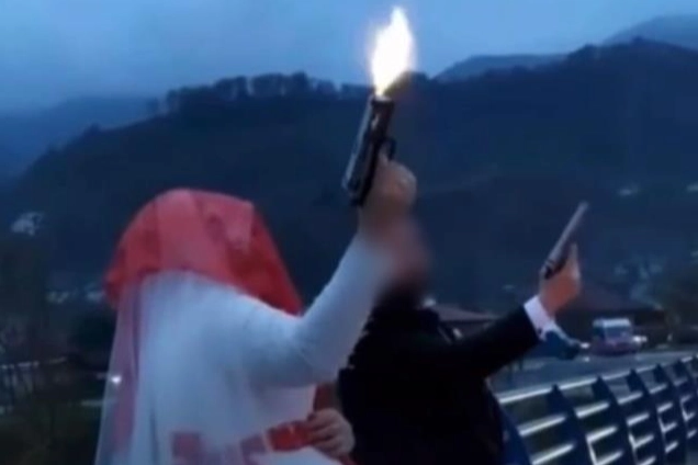 Sakarya’nın Akyazı ilçesinde gelin ve damadın en mutlu günlerinde ellerine aldıkları tabancalar ile havaya ateş açtığı anlar bu kadarına da ‘pes’ dedirtti. Akyazı ilçesinde geçtiğimiz günlerde dünyaevine giren çift, durdurdukları düğün konvoyunda skandal görüntülere imza attı. Bir köprünün üzerinde duran gelin ve damat ellerine aldıkları tabancalar ile havaya peş peşe ateş açtı. Çiftin yanı sıra o esnada bölgedeki bir kadın da eline aldığı tabanca ile havaya ateş açtı. En mutlu günlerini tehlikeye atan çiftin bu kadarına da ‘pes’ dedirten görüntüleri ise saniye saniye cep telefonu kamerasıyla kaydedilerek, sosyal medyada paylaşıldı.