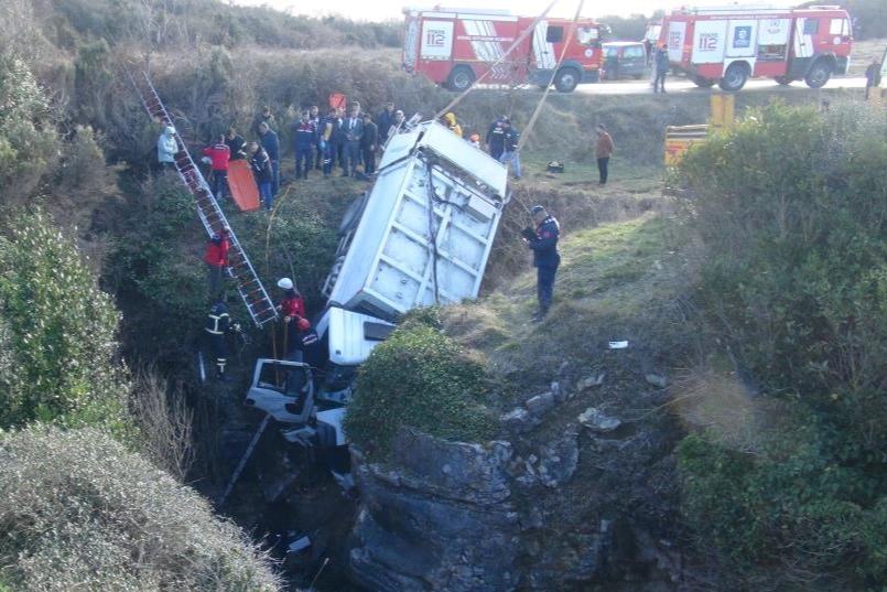Kocaeli'nin Kandıra ilçesinde sürücüsünün direksiyon hakimiyetini kaybettiği çöp kamyonu uçurumda asılı kaldı. 3 kişinin yaralandığı kazada araçta sıkışan sürücü yaklaşık 2 saat süren çalışmayla kurtarıldı.