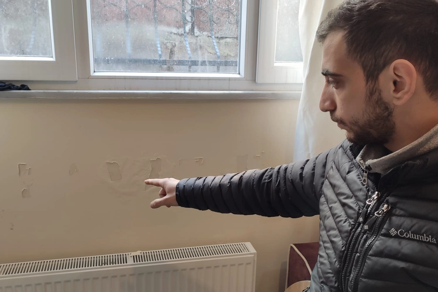 Mağdur Emre Polat, "Evi 10 Kasım 2020'de müteahhitten satın aldım. 3 ay sonra devamlı olarak asansör boşluğundan su gelmeye başladı. İnşaatı yapan müteahhidi defalarca uyardığımız halde ve bina sakinlerine söylediğimiz halde kesin bir çözüme ulaşamadık. Yaz yağmurlarının da başlaması ile birlikte, evin dört bir yanından su çıkmaya başladı. Müteahhit asansöre müdahale ettiği zaman, kendi ağzından hafriyat alırken zeminden çıkan su ile inşaatın tuğlalarını ördürdüğünü ve buradan tasarruf yaptığını söyleyip daha sonra inkar etti. Şuan da bu daireye her ay oturmadığım halde 2 bin TL ödeme yapıyorum. Eşim kayınvalidemde, ben ise babamlarda ya da dayımda kalıyorum. Çocuğumu bile göremiyorum. Her akşam kızım beni arayıp 'baba neredesin' diyor. Şuan da babalığımdan bile utanır hale geldim. Başka bir eve kiraya çıksam 3 bin TL'den aşağı değil. Asgari ücret ile çalışıyorum. Kirayı mı ödeyeyim, karnımı mı doyurayım, çocuğuma mı bakayım, hayatımı mı idame ettirmeye çalışayım, yoksa ben bu oturamadığım huzuru bulamadığım evin taksitlerini mi ödeyeyim. Bu işin içinden çıkamadım bir türlü çözüm bulamadım. Bir türlü muhatap bulamadığım için konuyu yargıya taşıdım" şeklinde konuştu.