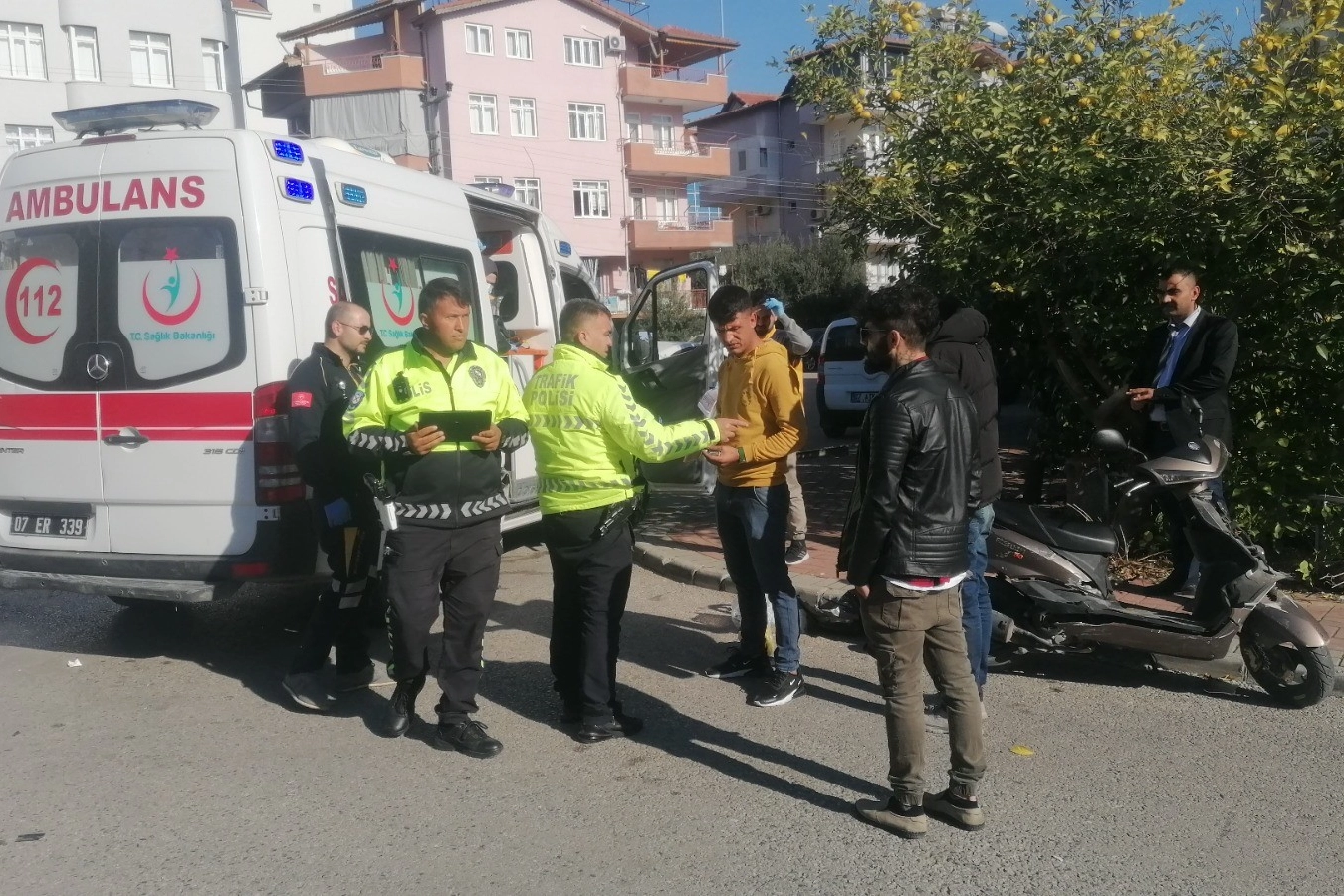 Antalya'nın Manavgat ilçesinde otomobille çarpışan motosiklet sürücüsü, kaskı sayesinde kazayı hafif yaralı atlattı. Motosiklet sürücüsü, telefonla aradığı bir kişiye motosikletini emanet ettikten sonra ambulansa bindi. Kazaya ait görüntüler güvenlik kamerasına yansıdı.