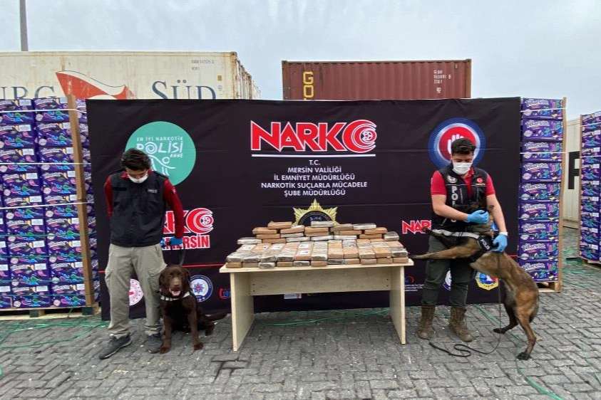 Edinilen bilgiye göre, İl Emniyet Müdürlüğü Narkotik Suçlarla Mücadele Şube Müdürlüğü ekiplerince, Güney Amerika ülkelerinden Mersin Limanına uyuşturucu getirileceği bilgisi üzerine çalışma yapıldı. Yapılan çalışmalar sonucunda, Ekvator'un Guayaquil Limanından Mersin Limanına getirilen muz yüklü konteynerler riskli olarak değerlendirildi. Riskli konteynerler gemiden indirilerek 'x-ray' taramasından geçirildi. Tarama sonrasında muz yüklü konteynerlerden birinde şüpheli yoğunluğa rastlanmasının ardından bu konteyner arama hangarına alındı. Narkotik dedektör köpeklerin de dahil edildiği aramada konteynerin ön bölümüne gizlenmiş 85 paket halinde 97 kilo 500 gram kokain ele geçirildi. Uyuşturucu maddelere el konulurken, şüpheli şahıslara yönelik çalışmaların devam ettiği bildirildi.
