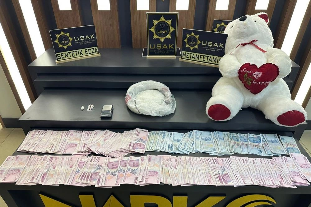 Uşak İl Emniyet Müdürlüğü bünyesinde Narkotik Suçlarla Mücadele Şube Müdürlüğü tarafından edinilen bilgiler doğrultusunda bir eve operasyon düzenlendi. Operasyonda uyuşturucudan elde edilen 87 bin TL para, 3 hassas terazi ve peluş ayı içerisine gizlenmiş 800 gram metamfetamin ele geçirildi. Ekiplerce gözaltına alınan 3 şüpheli de çıkarıldıkları mahkemece tutuklandı.