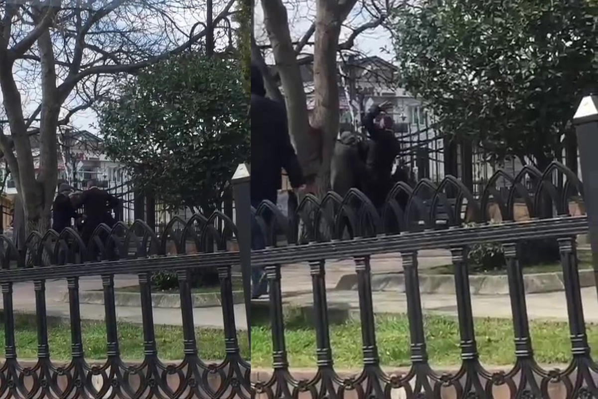 Görüntülerde, tartışan yaşlı adamların birbirlerine vurmaya çalışması, başka bir yaşlı adamın da kavgayı ayırmaya çalışması ve görüntüleri çeken vatandaşın olayı yorumlaması yer alıyor.