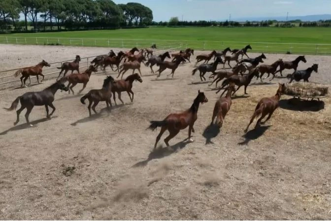 Yaklaşık 700 yıl önce, 1300 yılında Çiftlikat-ı Hümayun adı ile kurulan ve 1926'dan sonra Karacabey Harası olarak faaliyetlerde bulunan Karacabey Tarım İşletmesi, 1984 yılından bu yana TİGEM bünyesinde faaliyetlerini sürdürüyor. Bitkisel üretim ve hayvancılık faaliyetlerinin yürütüldüğü 89 bin dekar araziye sahip işletme, Türkiye'nin yarış atı üretiminde TİGEM'e bağlı 3 önemli merkezinden birisi olarak 1930'lu yıllardan bu yana ciddi gelir sağlıyor. Atatürk'ün oluşturduğu bir komisyonun Suriye ve Irak'a giderek anne ve babası belli olan kısrak ve aygır damızlık atları seçip Türkiye'ye getirmesiyle Arap atı yetiştiriciliğinin başladığı işletme, bugüne kadar ülkenin ün yapmış Arap atlarını kazandırdı. Bugün pistlerde koşan Arap atlarının yarısından fazlasını yetiştiren işletmede büyük bir titizlikle yetiştirilen Türk Arap atları drone ile görüntülendi. Her gün belli saatlerde açık alana salınan atların enerjilerini atmaları, koşuşturmaları ve birbirleriyle oynaşmaları görüntülere yansıdı. Karacabey Tarım İşletmesi İdari Müdür Yardımcısı Ali Yağlıcı, Türkiye'deki hemen hemen bütün aygır ve kısrakların kökeninin 1930'lu yıllarda getirilen atlara dayandığını belirterek, "Elimizdeki aygır ve kısraklarımızdan elde ettiğimiz tayların kökeni o döneme dayanıyor. Bu taylar o dönemden getirilen Arap atlarının 7'nci 8'inci kuşaktan torunları." dedi.