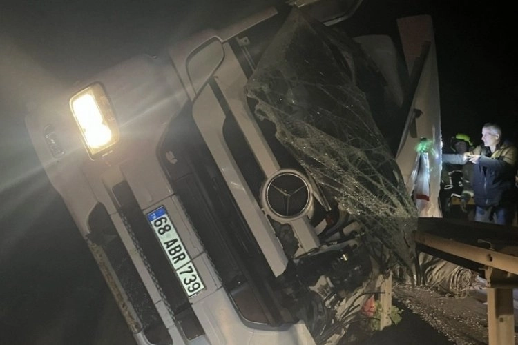 Sürücüsünün direksiyon hakimiyetini kaybetmesi sonucu kontrolden çıkan 68 ABR 739 plakalı tır, kaza yaptı.