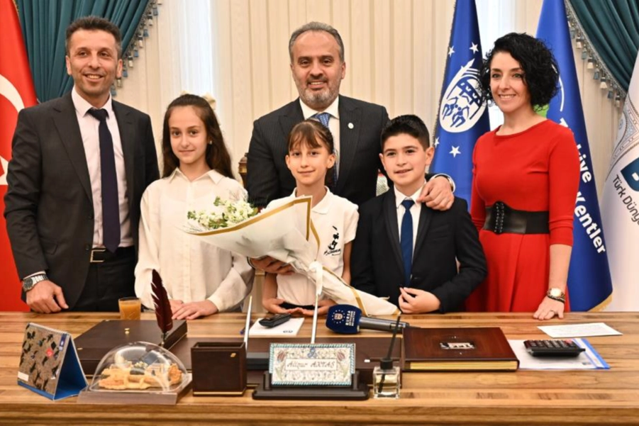 Ulusal Egemenlik ve Çocuk Bayramı nedeniyle tüm makamlar çocuklara kalırken, Bursa Büyükşehir Belediye Başkanlığı makamına da 3 yeni başkan oturdu. Makamını geleceğin başkanlarına devreden Bursa Büyükşehir Belediye Başkanı Alinur Aktaş, tüm çocukların bayramını kutladı.