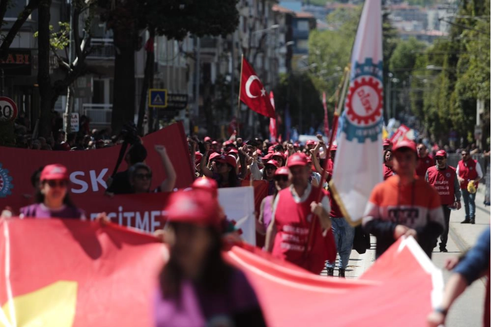 Siyasi partiler, sendikalar ve dernek temsilci ve üyeleri saat 12.00’de Stadyum Caddesi’nde toplanmaya başladı. Polis tarafından tek tek aranan vatandaşlar bayraklarla kortejler oluşturdu. 1 Mayıs’ı bazı vatandaşlar davullarla halay çekerek kutladı. Toplanmanın ardından binlerce emekçi, öğrenci, emekli Darmstad Caddesi’nden Kent Meydanı’na doğru yürüyüşe geçti. Dövizler taşıyan vatandaşlar sık sık sloganlar attı. Kalabalık Kent Meydanı’nda konuşmaların yapılacağı yere giriş yapmaya başladı.