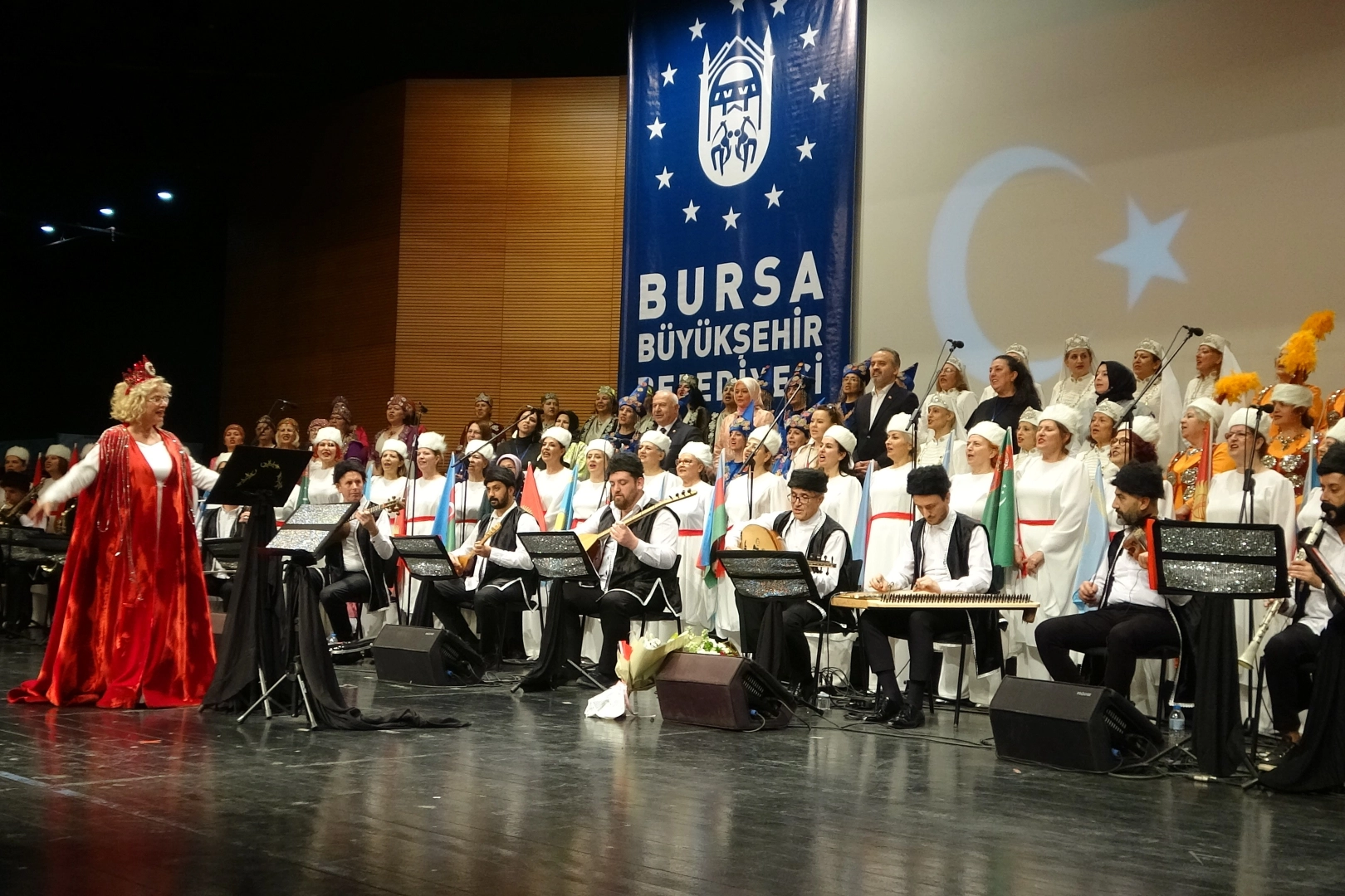 Hınca hınç dolan salonda konserin ilk bölümünde Nilüfer Kadın Korosu, Dr. Aysel Gürel şefliğinde Türk Dünyasından şarkılar söyledi. Halk dansları gösterileri izleyenlerden büyük alkış aldı.