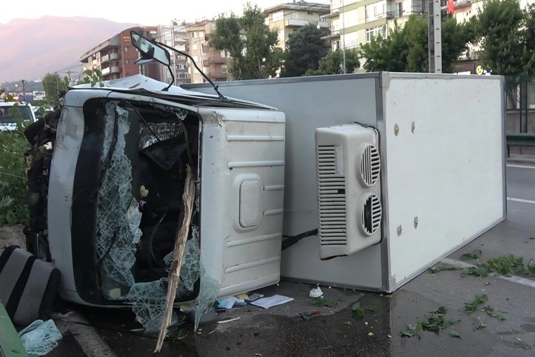 Bursa Mudanya Yolu istikametine seyir halinde olan Orhan Tosun (40) yönetimindeki 06 CED 88 plakalı kamyonet, kontrolden çıktı. Sürücünün direksiyon hakimiyetini kaybetmesiyle, yol kenarında bulunan bariyerlere ve ağaçlara çarpan kamyonet yan yatarak sürüklendi.