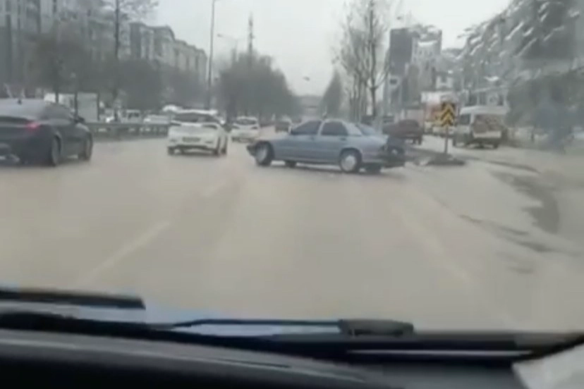 Bursa’da bir otomobil sürücüsü, yağmur nedeniyle kayganlaşan yolu fırsat bilerek drift attı, o anlar cep telefonu kamerasına yansıdı.