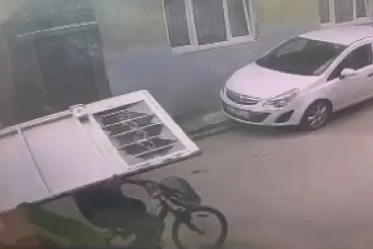 Kapıyı sırtlayarak bisiklete binen hırsız, bir eliyle kapıyı tutup diğer eliyle direksiyonu tutarak kayıplara karıştı.