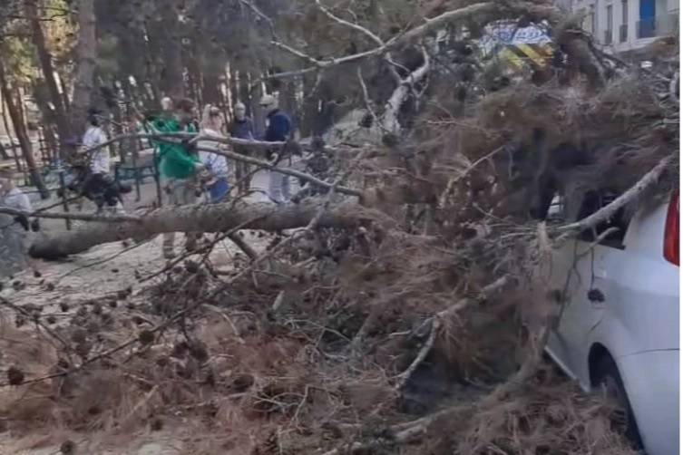 Park halindeki otomobilin üzerine devrilen ağaç araçta maddî hasar oluşmasına sebep olurken, şans eseri olay yerinde kimsenin bulunmaması faciayı önledi.