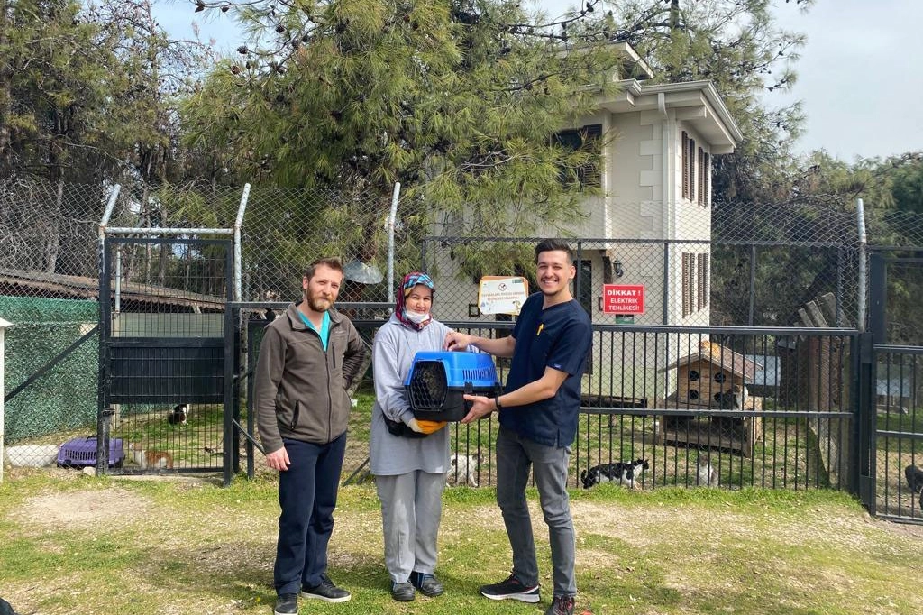 Gözünde katarakt olduğu belirlenerek tedavi edilen 2 yaşındaki sokak kedisi, Oğuzhan Taşkın isimli hayvan sever vatandaş tarafından sahiplenildi. Barınakta yeni can dostu ile buluşan vatandaş, sevimli kedinin bakımını üstlendi.
