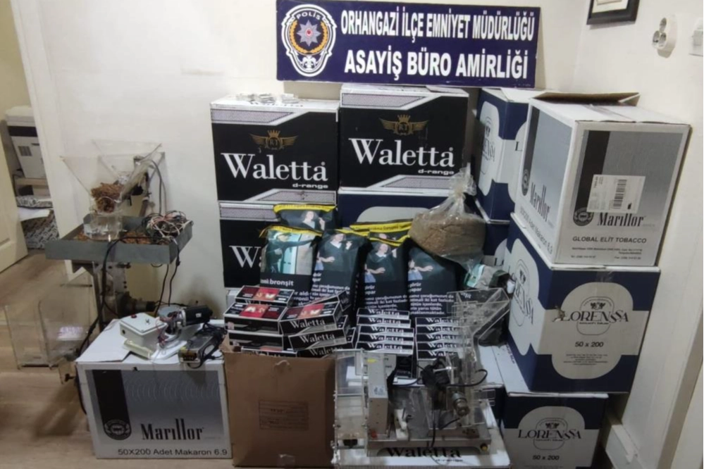 Orhangazi İlçe Emniyet Müdürlüğü Asayiş Büro Amirliği ekipleri, ihbar üzerine tütün kaçakçılığının önlenmesi ve suça karışan kişinin yakalanması amacıyla çalışma başlattı. Polis ekiplerince adım adım takip edilen B.D.’nin (50) tütün sakladığı öğrenildi. Cumhuriyet Savcısının talimatı ile B.D.’nin kiraladığı depoya operasyon yapan Orhangazi polisi, 1 adet büyük sigara doldurma makinesi, 1 adet küçük sigara doldurma makinesi, 19 adet ağzı açılmış 1 kilogramlık kıyılmış tütün, 50 adet 200’lük doldurulmuş makaron kutu, 622 adet 200’lük boş makaron kutu, 100 adet içerisi boşaltılmış tütün paketi ve 150 adet TABDK bandrolü ele geçirdi. Polis ekiplerince depodaki malzemelere el koyulurken, şüpheli şahıs ise ifadesi alınmak üzere gözaltına alındı.