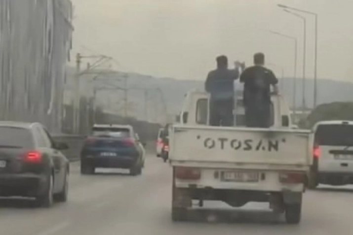 Merkez Yıldırım ilçesi Ankara Yolu Caddesi'nde iki kafadar seyir halindeki kamyonetin kasasında canları sıkılınca halay çekmeye başladı.
