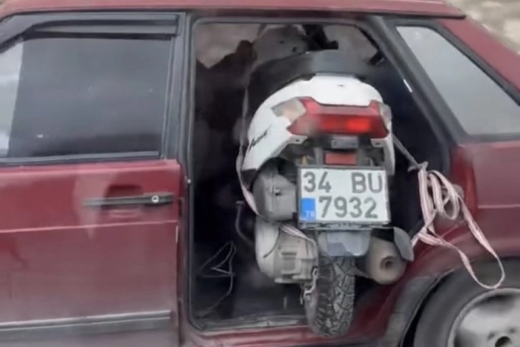 Bursa'da cadde üzerinde kapısız araçla trafiğe çıkan sürücü, arka koltuğa koyduğu motosikleti taşıdı. Trafiği tehlikeye düşüren sürücüyü görenler şaşkına dönerken, bazı sürücüler o anları amatör kamerayla kayda aldı. Kilometrelerce ilerleyen sürücü bir süre sonra kayıplara karışırken, görüntüler üzerine Trafik Şube Müdürlüğü ekipleri harekete geçti.