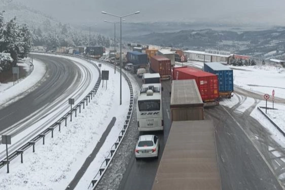 Bursa’da beklenen kar yağışına hazırlıksız yakalanan sürücüler yollarda uzun kuyruklar oluşturdu. İstanbul yolunda yoğun kar yağışı ve buzlanma sebebiyle kamyonlar ve araçlar yolu kapatınca trafik kilitlendi.
