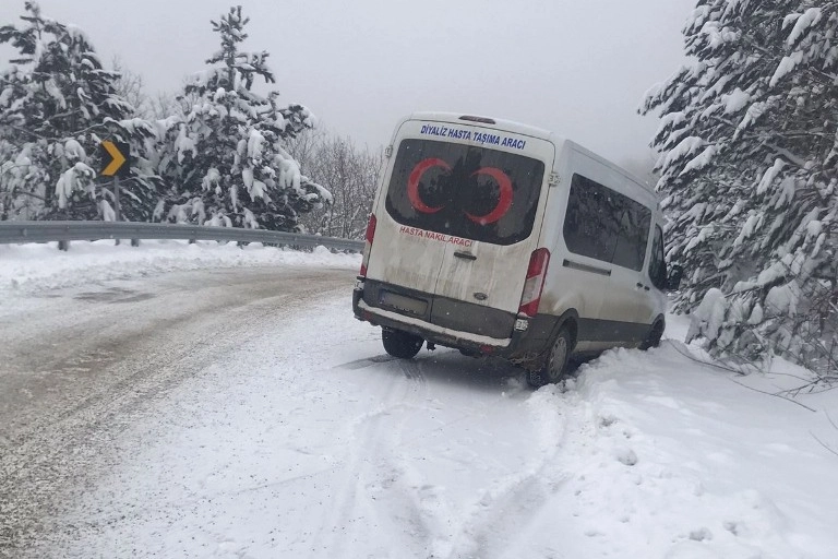 İnegöl’ün kırsal Çiftlikköy Mahallesinde ikamet eden Hasan Batmaz’ı diyaliz tedavisi için ikamet ettiği eve ulaşmak isteyen diyaliz hastanesi aracı yazlık lastik ile yolculuk yaptığı için yolda kaldı.