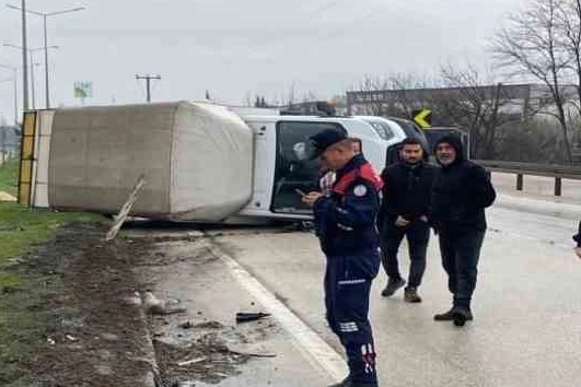 Kaza, Bursa-Ankara karayolu üzeri İnegöl girişinde meydana geldi. Bozüyük istikametinden İnegöl'e seyir halinde olan sürücü Suat Tozlu (34) yönetimindeki 34 BYJ 341 plakalı kamyonet, yağış nedeniyle kayganlaşan yolda sürücüsünün kontrolünden çıkarak devrildi. Kaza sonucu araçtaki yolcu Ömer U. (23) yaralandı, sürücü ise şans eseri yaralanmadı. Yaralı olay yerine sevk edilen ambulansla İnegöl Devlet Hastanesine kaldırıldı.