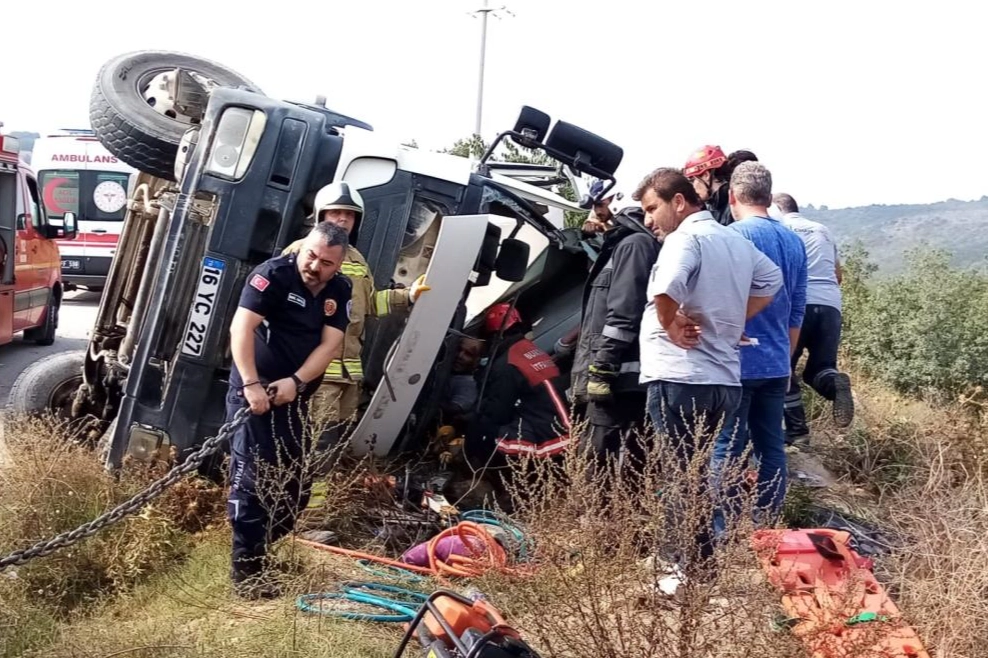 Bursa'da kontrolden çıkan beton mikserinin tarlaya devrildiği kazada araçta sıkışan sürücü itfaiye ekipleri tarafından kurtarıldı.