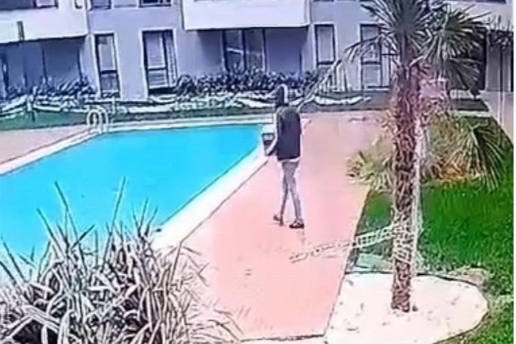 Görüntülerde kuryenin dalgın bir halde yürüdüğü, havuza düştüğü ve havuzdan çıkmak için çırpındığı görülüyor.
