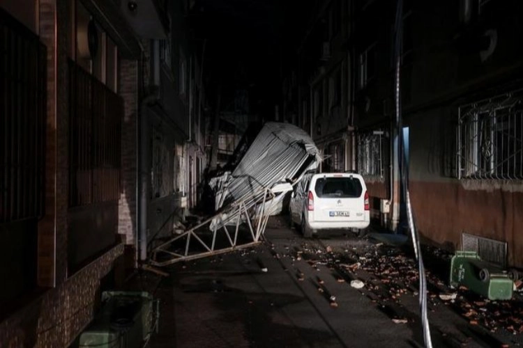 Şükraniye Mahallesi’nde lodosun etkisiyle bir binanın çatısı Yüksel Sokak'a uçtu. Elektrik tellerini koparan çatı parçaları, hafif ticari aracın üstüne düştü.