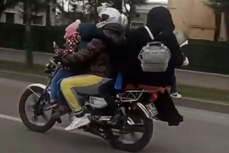 Bursa'da bir aile, motosiklete 6 kişi binerek ilerlemeye başladı. Merkez Yıldırım ilçesi Ankara Yolu Caddesi Duaçınarı mevkiinde seyir halinde olan motosikleti gören diğer sürücüler, tehlikeli anları saniye saniye amatör kamera ile kayda aldı. 6 kişilik ailenin tehlikeli motosiklet yolculuğu kamerada.