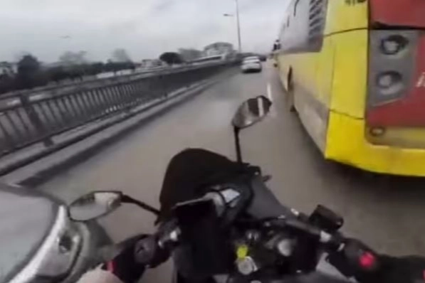 Olay, merkez Yıldırım ilçesi Ankara yolu üzerinde meydana geldi. Biranda hızlanan motosiklet sürücüsü, otobüse çarpmamak için solundan giden otomobilin önüne geçtiği an direksiyon hakimiyetini kaybetti. Sağa ve sola doğru yalpalayan motosiklet, sürücüsü kısa bir süre sonra direksiyonu toplamasıyla yoluna devam etti. Yaşanan korku dolu anlar, motosikletlinin kask kamerasına yansıdı.