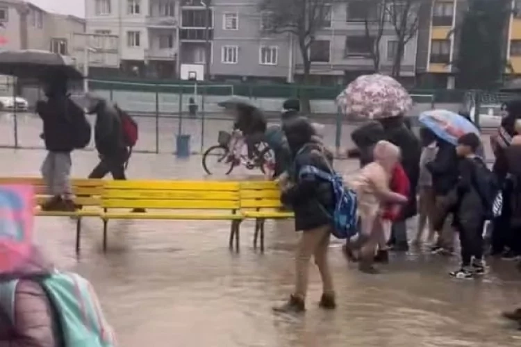 Olay Mahmudiye Mahallesi'nde eğitim öğretime devam eden Müşerref Muzaffer Samda İlkokulu bahçesinde meydana geldi. Yoğun yağış nedeniyle okulun bahçesi göle döndü. Veliler öğrencileri okuldan çıkarmak için bankları sıralayıp geçirdiler