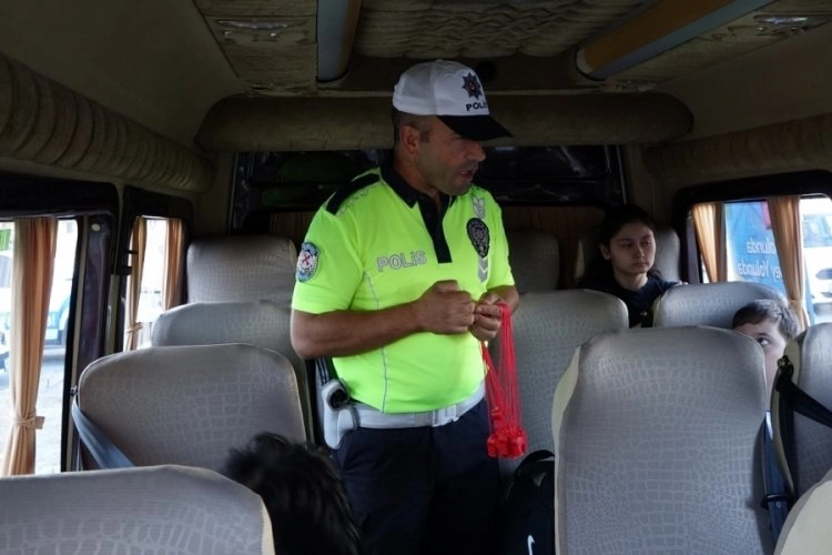 Bursa Trafik Denetleme Şube Müdürlüğü ekipleri, 'Okul Yolunda Her Şey Yolunda'sloganıyla kentin çeşitli bölgelerinde uygulama noktası oluşturup, okul servislerine yönelik denetim yaptı. Öğrenci servislerinin tek tek durdurulduğu denetimlerde, belgeleri eksik ve 'dur' lambası yanmayan araç sürücülerine cezai işlem uygulandı. Ekipler, öğrencilere de kırmızı düdük hediye edip, trafik kurallarına ilişkin bilgilendirme yaptı.