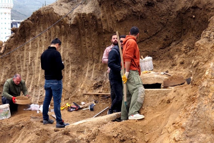 Bursa'da Mudanya Belediyesi kapalı pazar yeri inşaatının çevre düzenlemesi sırasında ekskavatörün kepçesine takılan taşın altından tarihi lahit çıktı.