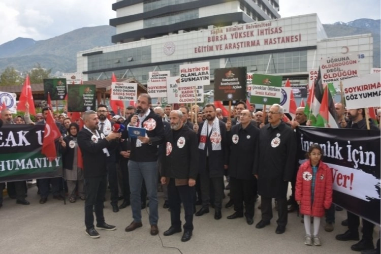 Platform adına basın açıklamasını gerçekleştiren Sağlık-Sen Bursa Şube Başkanı Gökhan Yünkül, "Bugün burada Katil İsrail'in Gazze'de yaptığı soykırımı ve özellikle hastanelerin bombalanmasını, sağlık çalışanlarının şehit edilmesini protesto etmek üzere toplandık. Sağlık çalışanlarımızı temsil eden beyaz önlüklerimizi çıkardık. Siyah önlüklerimizi giydik. Gazze'de artık beyaz önlüğün anlamı kalmadı. Kanla lekelenerek kızıla boyanan önlükler yıkılan enkazların tozu toprağıyla siyaha döndü. Bizler de hayatını kaybeden Gazzeli sağlık çalışanlarımız için siyah önlükler ile meydanlarda onların yanında olduğumuzu haykırıyoruz" dedi.