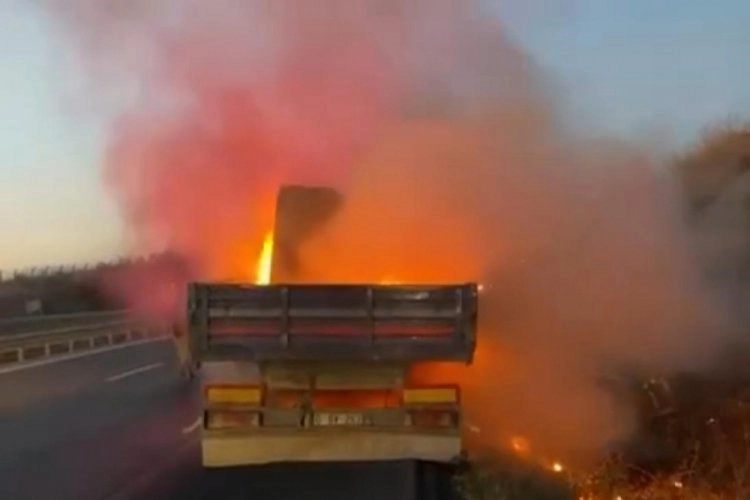 Bursa'nın Mustafa Kemal Paşa ilçesinde sürücüsünün idaresinde olan tırın dorse kısmında bir anda dumanlar yükseldi. Sürücünün durumu fark etmesiyle araç hemen kenarı çekildi. Hızla büyüyen alevler tırdan anayoldaki otluk alana sıçradı. Sürücünün ihbarı üzerine olay yerine itfaiye ekibi sevk edildi. Alev topuna dönen tırı söndüren ekipler yol kenarında otluk alana sıçrayan alevleri de hızla söndürdü. Tırın alev alev yandığı anlar kameraya yansırken, yangında korkulan olmadı.