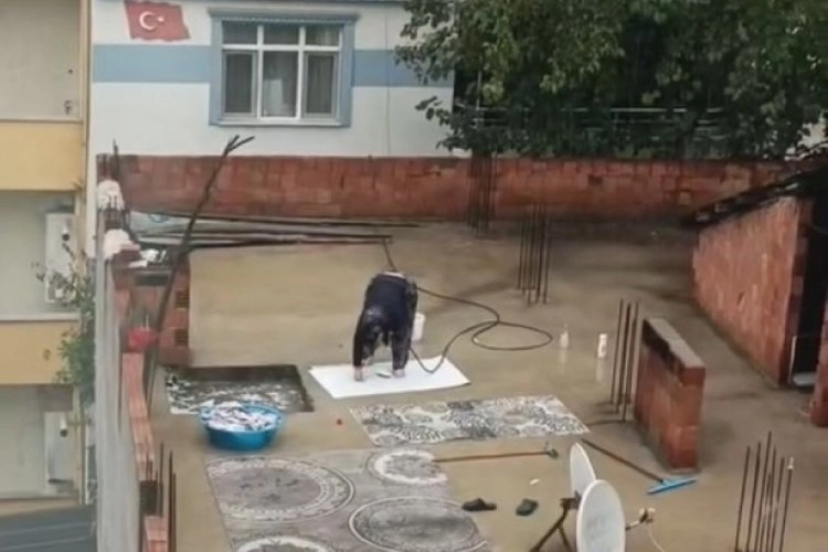 Belediyenin uyarısı ve kesintilere rağmen bir kadın apartman çatısında halı yıkarken görüntülendi.
