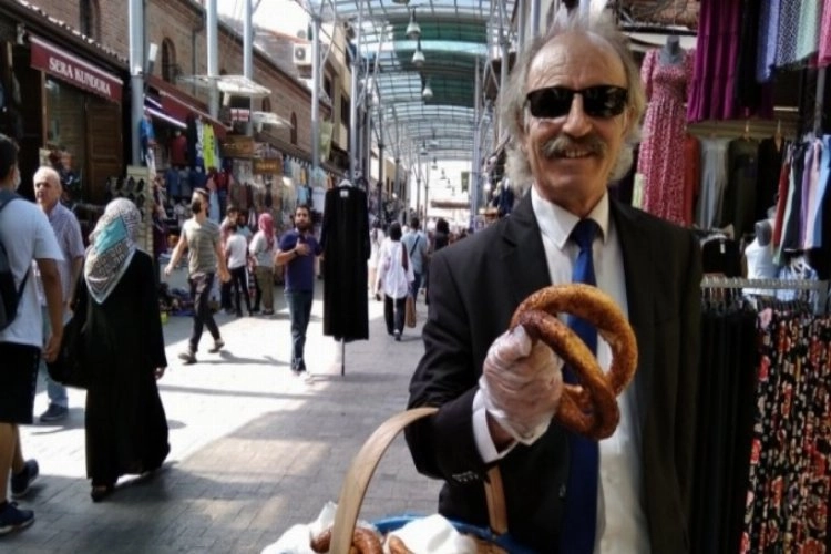 Bursa'da takım elbise giyip çarşıda sepetle simit satıyor.