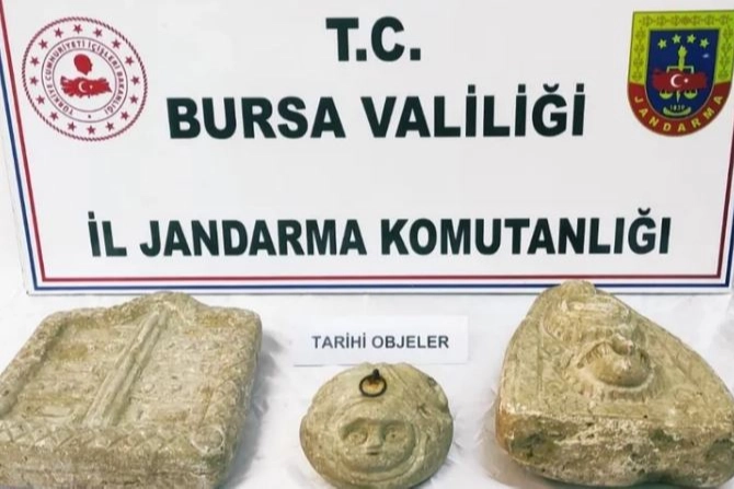 Gürsu İlçe Jandarma Komutanlığı ile İstihbarat Şube Müdürlüğü ekipleri tarafından Kumlukalan Mahallesi’nde şüpheli bir araç durduruldu. Cumhuriyet Savcılığı’ndan alınan arama kararına istinaden araçta yapılan aramada, tarihi eser niteliğinde olduğu değerlendirilen 3 adet obje ele geçirildi. Araçta bulunan N.L. ve M.K. isimli şahıslar gözaltına alındı. Şüpheliler, işlemlerinin ardından sevk edildikleri adli makamlarca adli kontrol şartıyla serbest bırakıldı. Olayla ilgili soruşturma sürüyor.