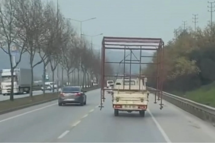 Diğer sürücülerin ikazına aldırış etmeyen sürücü, tehlikeli taşımacılığına devam etti. O anlar saniye saniye amatör kameraya yansıdı.