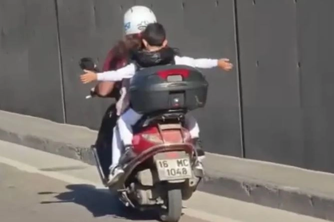 Yürekleri ağza getiren görüntüler kameraya yansıdı. Olay, Yıldırım ilçesi Erikli mevki Ankara Yolu Caddesi üzerinde meydana geldi. Edinilen bilgiye göre, trafiğe çıkan adam, arkasına herhangi bir ekipman bulundurmadan aldığı iki çocukla trafiğe çıktı. Sürücü seyir halindeyken, arkasındaki çocuklar ise bulunduğu durumu oyuna çevirip ellerini açarak yolculuk etti. Tehlikeli yolculuk kilometrelerce sürerken, o anlar trafikteki başka sürücülerin kamerasına yansıdı.