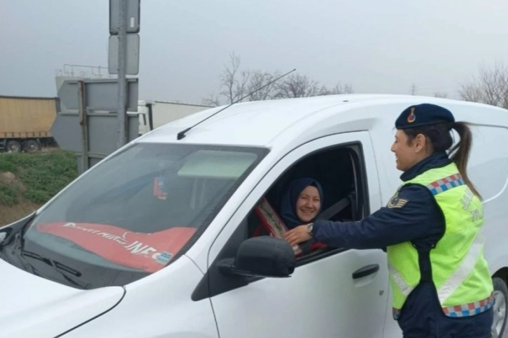 Bursa İl Jandarma Komutanlığı Trafik Şube Müdürlüğü Ekipleri, kadın sürücülerin 8 Mart Dünya Kadınlar Gününü kutladı. Aralarında kadın jandarmalarında bulunduğu ekipler kadınlar gününe özel kadın sürücülere çiçek dağıttı.