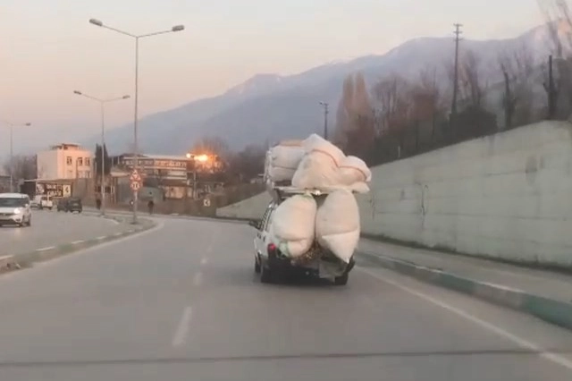 Otomobilde diğer insanların canını tehlikeye atarak tonlarca yük taşıyan kişi, pes dedirtti.