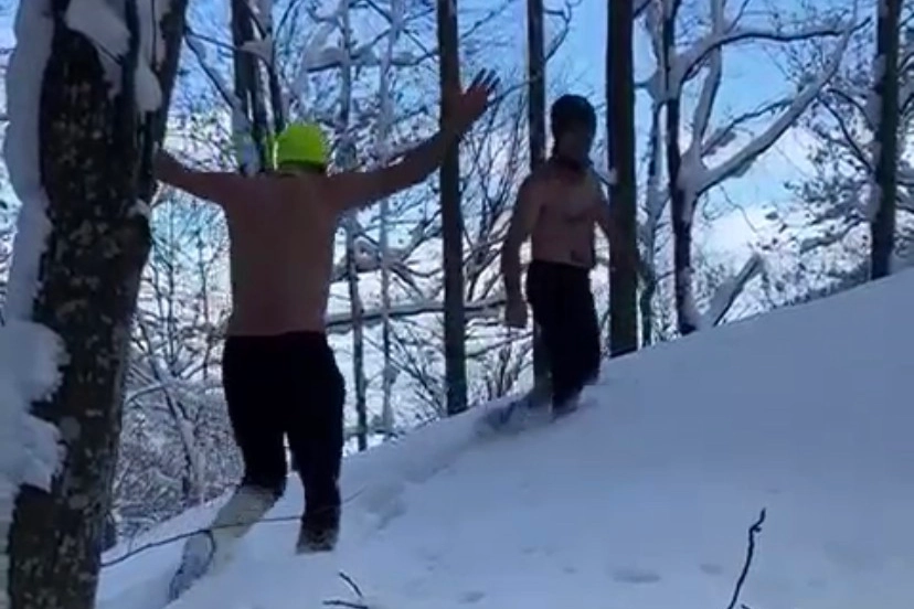 İki kafadar yarı çıplak şekilde kara gömüldüler, zaman zamanda karda koşarak kara atladılar.