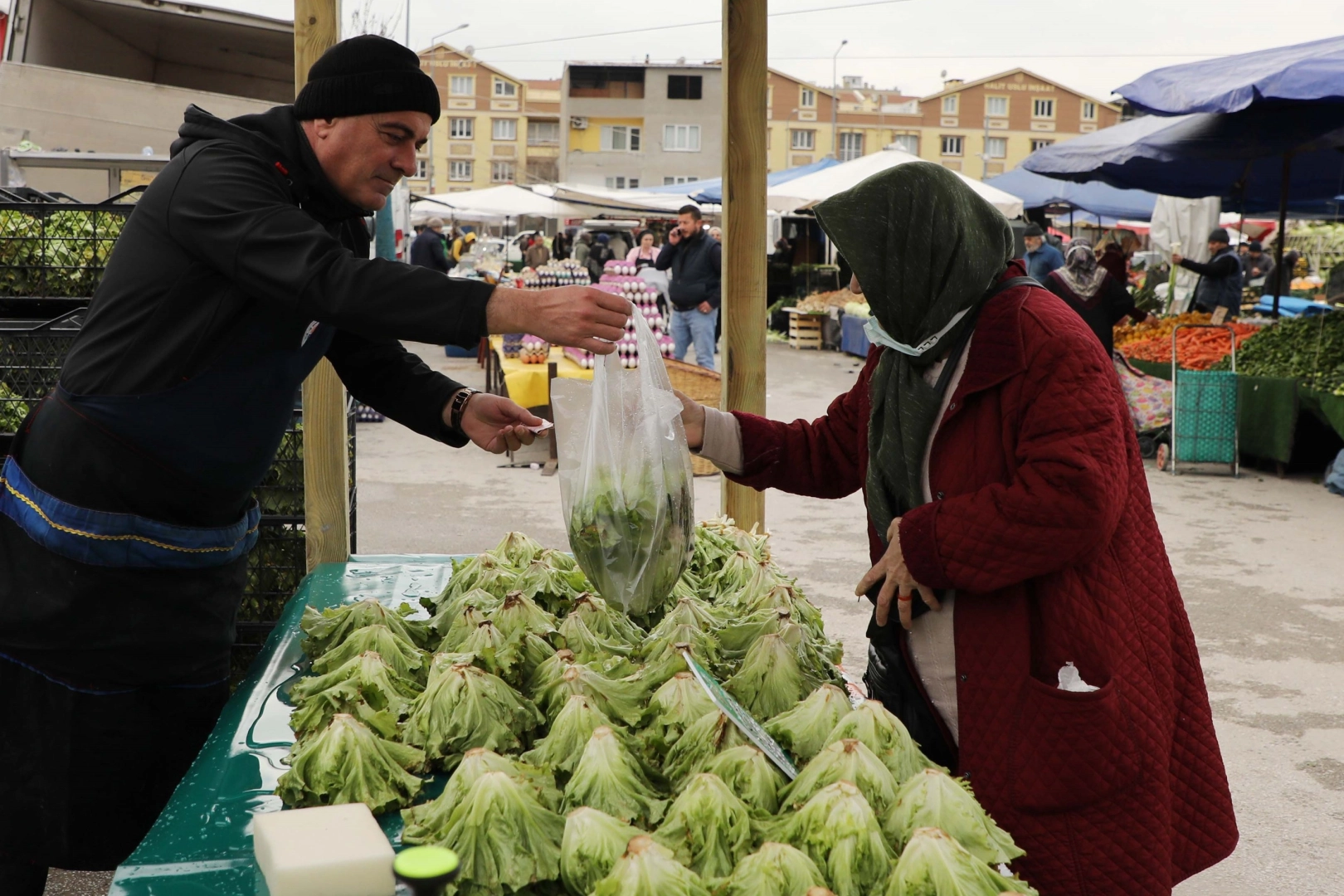 Perşembe Pazarı’nda kurulan tezgâhlarda sergilenen tamamen organik, orta boy marul, piyasa fiyatının yarısına, 5 liraya satılıyor. Tezgâhta ilk satışları Gemlik Belediye Başkanı Mehmet Uğur Sertaslan gerçekleştirdi. Pazarcı önlüğünü giyen Başkan Sertaslan, hem satış yaptı hem de pazara gelen Gemlikliler ile sohbet etti.