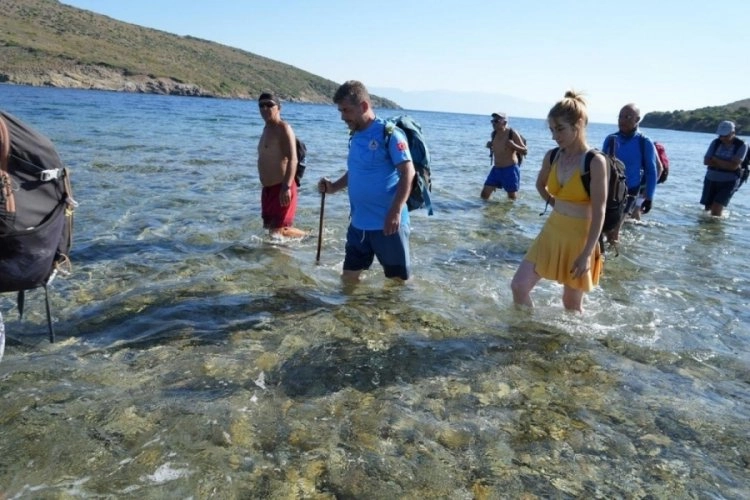 Yürüyüş grubu lideri Erhan Çiftçi öncülüğünde yapılan etkinlikte, doğa tutkunları Cunda Adası'nın Pateriça Burnu'ndan yürüyüşe başladı. Katılımcılar, Yalancı Boğaz üzerinden, deniz seviyesinin yürümeye elverişli olduğu dar bir geçidi kullanarak Maden Adası'na ulaştı.