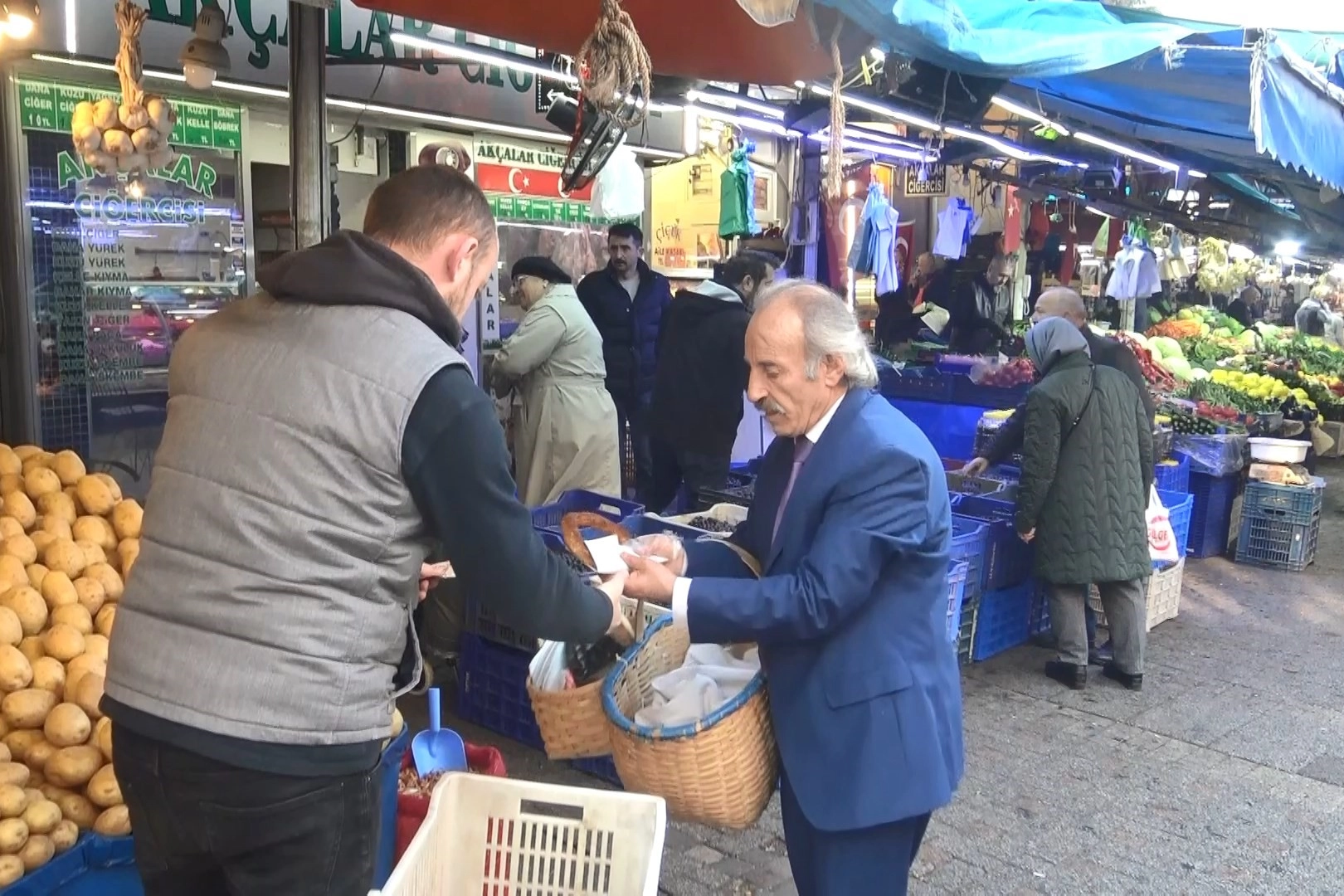 Bursa'da memur emeklisi Ahmet Berksun, soğuk havaya aldırış etmeden takım elbise giyerek koluna taktığı sepetle tarihi çarşıda simit satıyor.