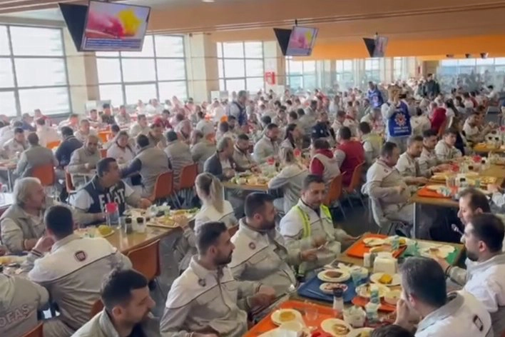 MESS sendikası tarafından 2023 - 25 toplu iş görüşmeleri sonrası yüzde 35'lik ücret zammını beğenmeyen Tofaş işçileri fabrika yemekhanesinde bir araya gelip yüzde 35'lik ücret zammı teklifine tepki gösterdi.
