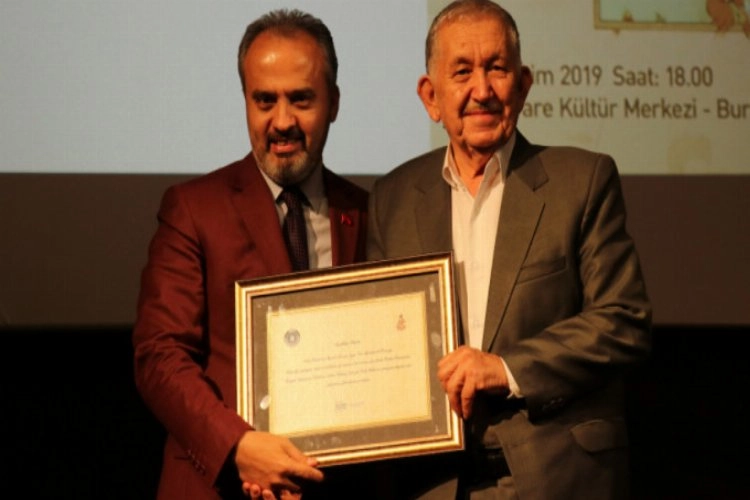 Bursa Büyükşehir Belediye Başkanı Alinur Aktaş, Tayyare Kültür Merkezi'nde düzenlenen "Veli Muhammed Hoca'ya Saygı" programında, eseri bilim dünyasına kazandıran Hoca'ya teşekkür beraatı takdim etti.