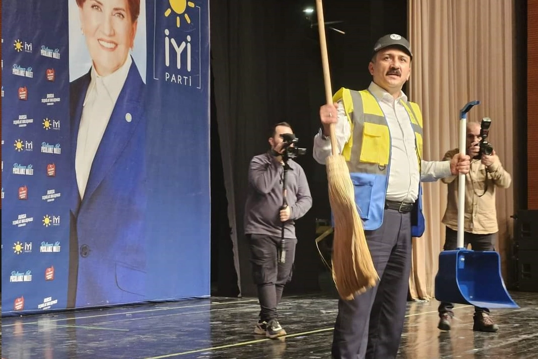 Selçuk Türkoğlu konuşmasını yapmak üzere sahneye Bursa Büyükşehir Belediyesi’nin işçilerine ait üniformayı üzerine giyerek eline süpürge ve kürek alarak çıktı.