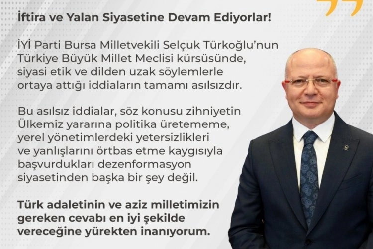 "Genel Başkanımız ve Cumhurbaşkanımız Sayın Recep Tayyip Erdoğan'ın da ifade ettiği gibi; Türkiye'de nitelikli muhalefet açığı vardır. Bu ihtiyacın, ne yazık ki günden güne daha da büyüdüğünü ibretlik örneklerle görmeye devam ediyoruz. İYİ Parti Bursa Milletvekili Selçuk Türkoğlu'nun, bugüne kadar olduğu gibi yalan ve iftiralarla gündem oluşturma gayreti, belediyenin yaptığı normal hizmetleri bile amacından saptırarak, temsil ettiği görevin saygınlığına uymayan hezeyanlarına yenilerini eklemesi de bu minvalde bir örnektir" dedi.
